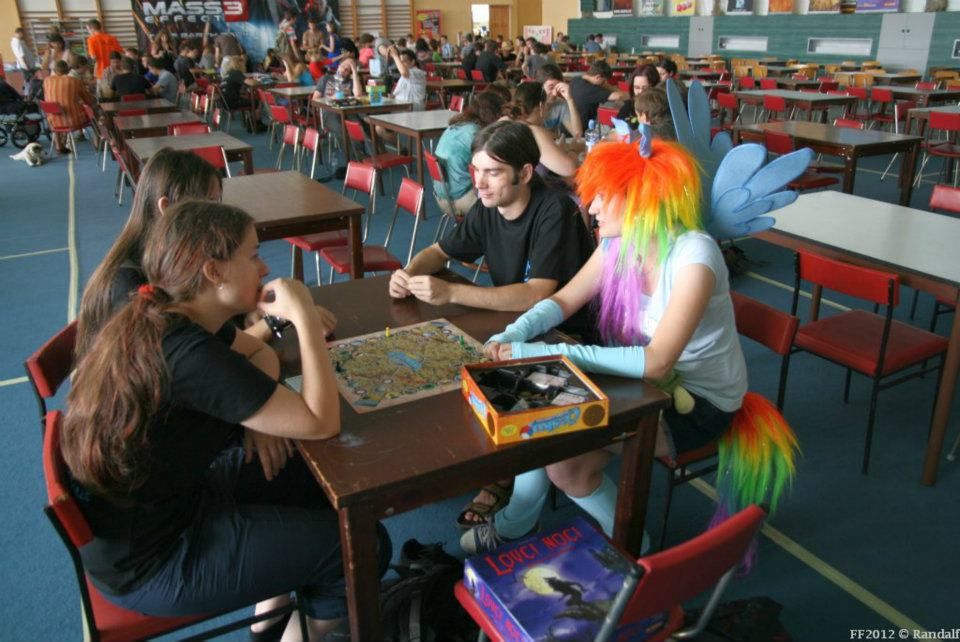 Většinou dorazíte na FFko, když už je v plném proudu. Pokud zde máte známé a přátele, jako já, máte to snadné. Najdete se a oni vám pomůžou rychle se s festivalem sžít a dostat se do conového tempa. Jestliže zde nikoho neznáte, a tím pádem jste si v bodě dva a tři museli poradit nějak sami, nezoufejte. Projděte si program a vyberte si přednášku, besedu či cokoli jiného zabývající se tématem, o něž se zajímáte a máte ho rádi. Tady potkáte lidi, kteří s vámi vaši zálibu sdílejí a určitě si o ní rádi popovídají. Nebo si zajděte zahrát některou z mnoha deskových her, které fungují jako spolehlivý ledoborec. Nezapomeňte na důležité pravidlo conu – ke vstupu do jednotlivých objektů je třeba nosit viditelně vstupenku, případně ji na požádání ukazovat.