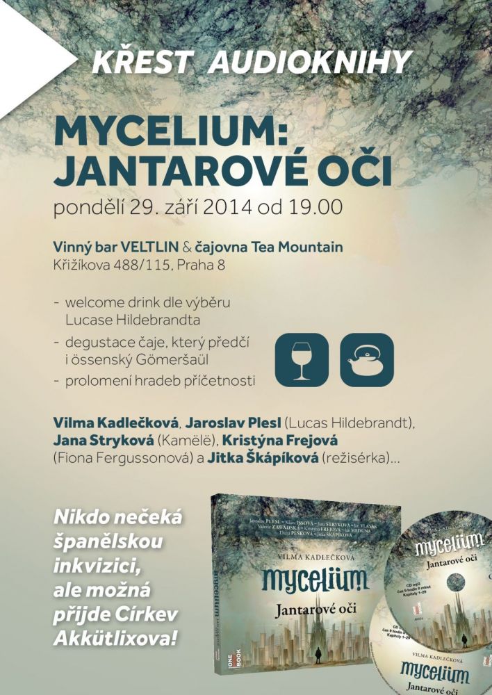 Zaujala vás velkolepá audio adaptace nejlepšího českého sci-fi románu loňského roku Mycelium: Jantarové oči v podání devíti pečlivě vybraných interpretů? V tom případě nesmíte propásnout její křest, který se uskuteční v pondělí 29. 9. od 19.00 ve vinném baru VELTLIN & čajovně Tea Mountain.