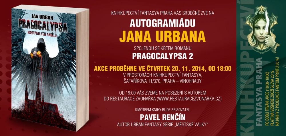 Ve čtvrtek 20. 11. proběhne ve specializovaném sci-fi a fantasy knihkupectví Fantasya autogramiáda mladého autora Jana Urbana spojená se křtem jeho nového románu “Pragocalypsa: Krev padlých andělů”.