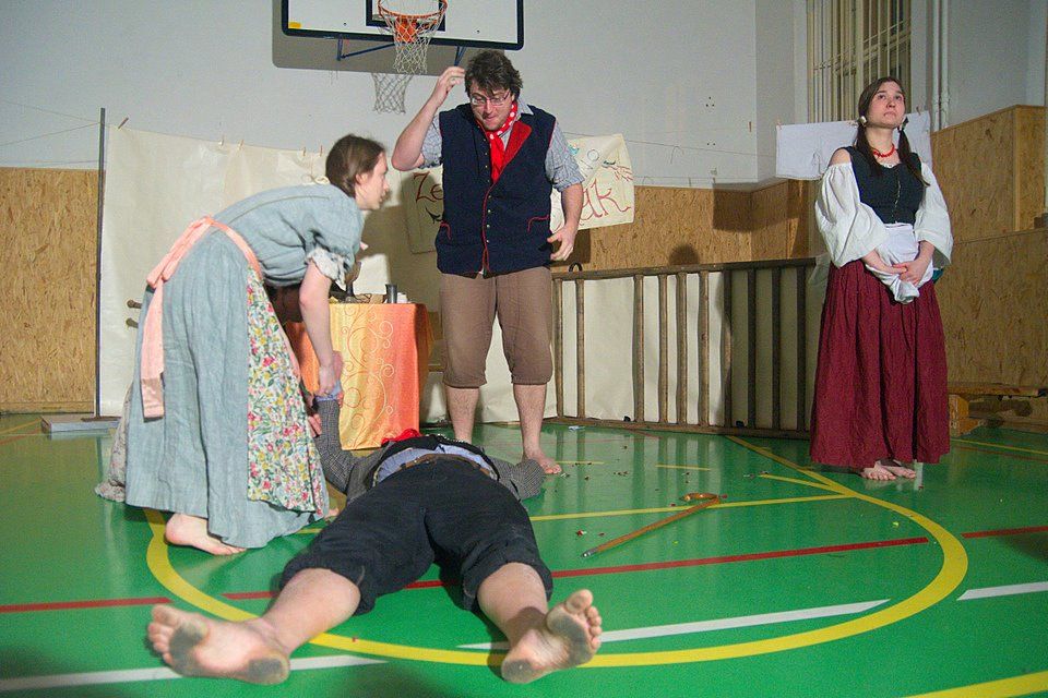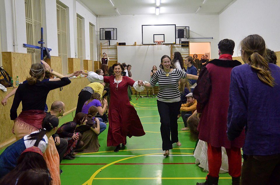 Po dobývacích strojích se většina odebrala ke křepčení v tělocvičně při irsko-skotském reji a já se odebral do zákulisí conu k reji za účelem připravit scénu a nezbláznit se z toho.