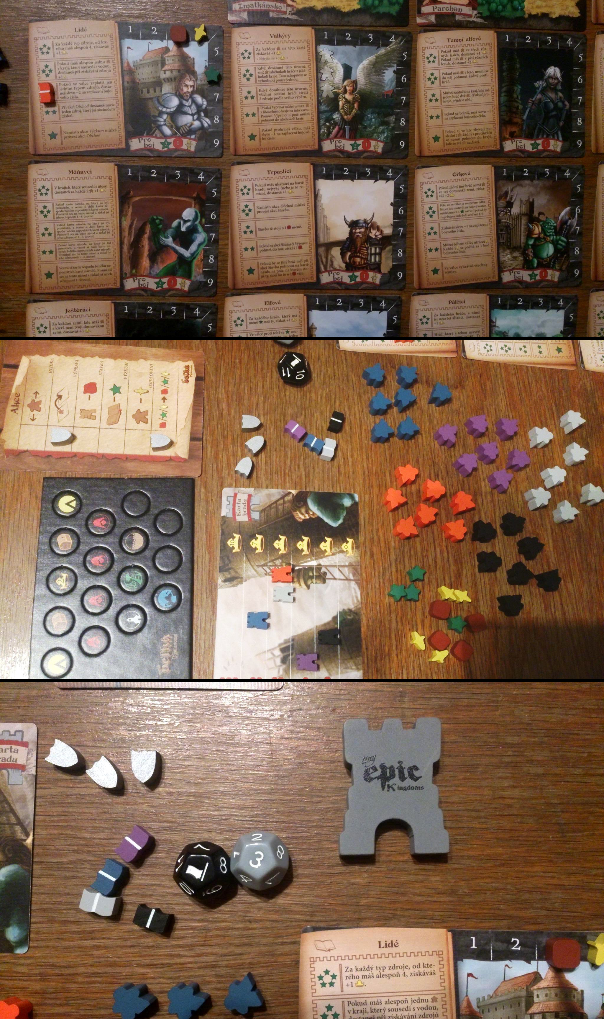 Protože jsou tahle království malá, dostanete do začátku jeden národ a sedm figurek, pár žetonů označujících stavy zásob a magie na počítadlech, a domovskou krajinu, ve které začnete své tažení za ovládnutím světa. Komodity jsou omezeny na jídlo, rudu a magii, počet akcí na jednu za tah, a hrad si stavíte postupováním po žebříčku jeho úrovně. Malé, snadno rozložitelné, rychle vysvětlitelné a bryskně odehratelné.
