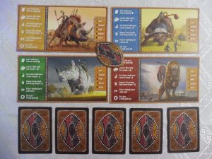 Jenže. Jenže jenom jednotka, do níž je začleněn alespoň jeden šampion, vybojuje svému hráči nějaké body navíc, a jenom území savany, na kterém je alespoň jeden válečník, může na konci tahu poskytnout potravu pro jednu kartu ve vašem portfoliu. Karty, které „neuživíte“, musíte zahodit, a s nimi vám utečou i figurky, které jste jejich prostřednictvím nasadili – pravda, pouze do vaší zásoby, ale kol zase není tolik, abyste si mohli klidně říct, že není-li tahle, bude jiná. Naopak, často vás ztráta jednoho každého bojovníka bude zatraceně mrzet.