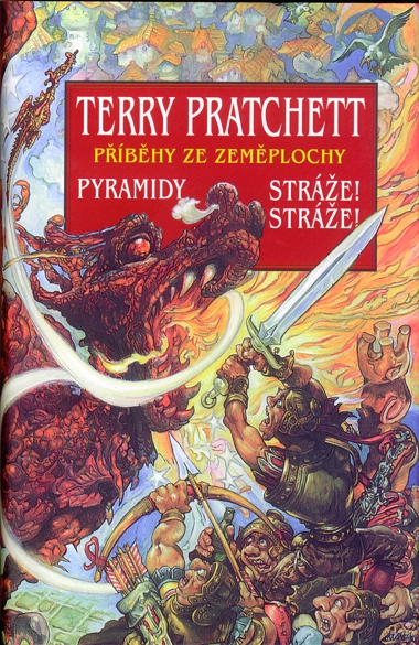 Jakýsi tajemný noční tvor mění obyvatele Ankh-Morkporku v něco, co silně připomíná tablety živočišného uhlí. A tady začíná obtížný úkol kapitána Elánia, velitele Noční hlídky městské stráže. Ve městě plném zmatků, tablet živočišného uhlí, tajných spolků a bláznivých chovatelek draků pátrá kapitán a s ním muži hlídky – seržant Tračník, desátník Nóblhóch i nově příchozí svobodník-čekatel Karotka – po stopách vedoucích k rozřešení celé záhady. * Není snadné být faraonem v pubertě. Nesmíte s sebou nosit peníze, ovoce vám loupají mladé ženštiny nevázaných mravů, kdekdo si myslí, že můžete za to, že vychází slunce a kukuřice roste. Neustále se vám zdá o sedmi hubených a sedmi tučných kravách, a k tomu všemu ještě díky parakosmické nestabilitě vybuchne Velká pyramida. Pak si ještě musíte poradit se všemi těmi vrahy, sfingami, dřevěnými koňmi, filozofy, svatými krokodýli, chodícími mumiemi, dravým stavitelem pyramid a s Hitem se supí hlavou, který je bohem všech neočekávaně příchozích. Přitom všechno, co byste opravdu chtěli, je udělat něco pro mladé lidi a starobylý střed města. * V pořadí již čtvrtá dvojkniha románů z Úžasné Zeměplochy, vázaná v červených deskách se zlatou ražbou a s velmi kvalitním papírem uvnitř, na němž se dobře vyjímají černobílé ilustrace Paula Kidbyho.