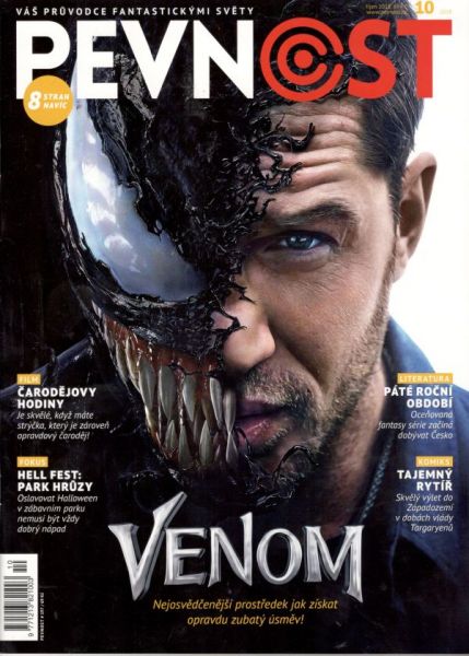 Na rovinu, VENOMA přístupného třináctileté omladině si neumíme představit. Jelikož ale náš oblíbený symbiont za velkou louží trhá všechny rekordy, je jasné, že Tom Hardy natočil další velký biják. A protože je VENOM i přes svoje cool brutální hlášky pořád trochu hororová figura, budeme se o strachu bavit i na dalších stránkách. Do kin totiž již brzy vstoupí také HELL FEST: PARK HRŮZY a u příležitosti toho se také podíváme i na všechny filmové děsáky, které se točí kolem ruských kol, klaunů, strašidelných hradů a dalších propriet ze zábavních parků. Stejně tak ale podrbeme o novém PREDÁTOROVI a parádnických ČARODĚJOVÝCH HODINÁCH. Ze seriálu přitom tvrdí muziku ponurý CASTLE ROCK a mile diverzantský a s fantazáckými klišé žonglující DISENCHANTMENT. A to už se na nás valí literatura a společně s ní hned triumvirát pozoruhodných ság. Další konec světa nastane společně s PÁTÝM ROČNÍM OBDOBÍM, temného elfa Drizzta od R. A. Salvatoreho pak čekají SPOLEČNÍCI a v rámci Kronik železného druida se představí PROHNANÝ. Na nebezpečí číhající na sociálních sítích přitom upozorní ZERO od Marka Elsberga. Společně s HUMBOOKem, kterého jsme hrdým partnerem, vám ale představíme také Petru Machovou a její DRAČÍ MĚSTO a program celého festivalu. A protože Vikingů není nikdy dost, vrátíme se k minulému číslu rozhovorem s Lasse Holmem a také velkým článkem v historické sekci. Anebo si raději dopřejete nálož povídek od Petra Klepala a Pavla Bareše? Ani tím jsme ale neřekli poslední slovo. Z řad PROFÍKŮ vám bude nově radit Jiří Pavlovský. Mezi komiksy nahlídneme na západozemského TAJEMNÉHO RYTÍŘE a na LARU CROFT. Od Pavla Renčína se necháme pozvat do KLUBU VRAHŮ. A obrázky k nám přicestovaly z KRONIK NOVÉHO ILLENU. Docela nášup, no ne? Inu, za důvěru jakost. I říjnová Pevnost vládne a zve vás do svých bran!!!