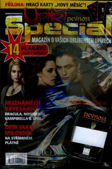 KDYŽ SE SETMÍ.. * Pokud dnes řeknete slovo „stmívání“, většinou se nesetkáte s reakcí v podobě halekání matek, svolávajících drobotu k večeři. Nikoli, dostane se vám buď očí zvrácených znechucením v sloup, či frenetického přikyvování, doplněného zasněným výrazem ve tváři.. dotyčné. * Ano, zatímco první grimasa patří (povětšinou) muži, ta druhá (povětšinou) ženě, a to bez ohledu na věk, národnost, rasu či vyznání. A ať si vousatější polovička lidstva říká, co chce, to už zavání fenoménem. Takže ať už jste toleratní chlapák nebo osoba něžného pohlaví, pojďte si s námi (a s Belliným vlkodlačím kámošem Jacobem) zavýt na Nový měsíc…který by měl prostříbřit tuzemské kinosály již 26. 11. 2009, tedy jen pár dní povydání našeho Speciálu. V poněkud netradičním foto-románu jsme se rozhodli na druhý díl Ságy Stmívání podívat poněkud žertovně, s nadsázkou, ale jak doufáme, také s citem pro to, co máte rádi. A protože neradi vytrháváme věci z kontextu, tématu zůstaneme věrní i nadále: v retro-recenzi si připomeneme filmové Stmívání a v letmém ohlédnutí také knižní cyklus, jenž na letošní vánoční trh přichází v exkluzivní vázané úpravě. * A protože rovněž neradi kloužeme po povrchu, zasadíme sérii Stephenie Meyerové i filmové adaptace prvních dvou dílů do poněkud širších souvislostí. A začneme pěkně od špičáků: ti z vás, kterým ze rtů dosud neoschlo mléko, natožpak krev, si budou moci našprtat všechny zásadní průvodní znaky tzv. „upíra obecného“ a rovněž si promrskají ty nejznámější krvesaje, jaké dosud fantazie tvůrců – ať už literárních či filmových – zrodila. Pro ty sečtělejší z vás pak máme několik ochutnávek z dalších „vampýrských romancí“, které by dříve či později mohly šlapat Sáze Stmívání na paty. * A vy, kteří jste dosud marně přemýšleli, jak vyzdobit svůj pokojíček či internátní jizbu, jistě oceníte čtrnáct plakátů právě s hrdiny Nového měsíce. A až vás přestane bavit zádumčivě hledat krvavou pravdu v jejich očích, můžete si s exkluzivním balíčkem hracích karet zpestřit nejeden pochmurný večer či nudnou výuku. * Zbývá jen nastavit hrdla..