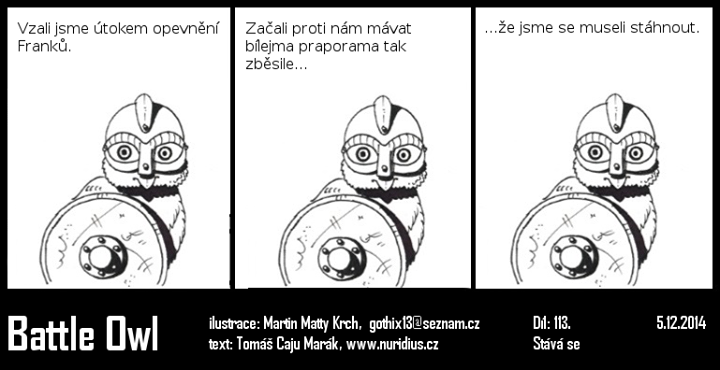 Ve výsledku se tedy jedná o poměrně příjemnou, byť specifickou záležitost, kterou přes jistou obsahovou rozháranost drží dva pilíře v podobě humoru a kresby. Battle owl se tak vedle Korektora nebo Hajzla nemusí stydět. Na českém trůnu ovšem v mých očích stále pevně sedí opráskoví Zmikund.