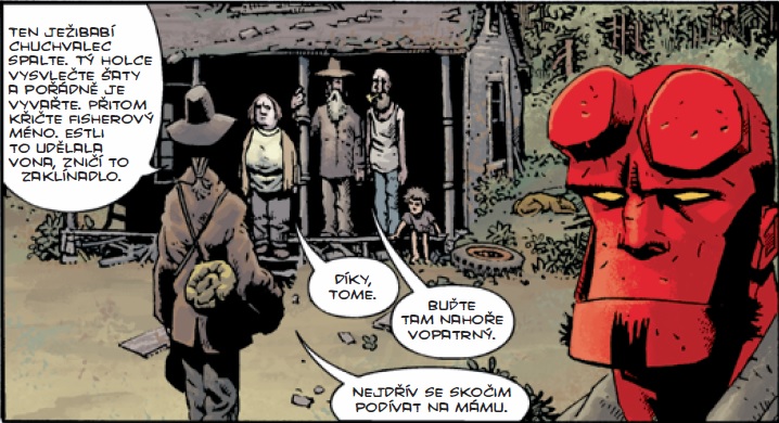 Příběh z amerického vidlákova, kde narazíte na vše z populárního odvětví strachu a hnusu. A musím narovinu říct, že se mi ještě nestalo, že bych otočil stránku, vyprskl pití a znechucením zavřel oči. Až nyní. A mohu za to poděkovat Richard Corbenovi. Pocity strachu a hnusu nevyvolává ani tak Mignolův scénář (zombie, čarodějnice a hmyzáky jsme přece jen viděli mnohokrát), ale především Corbenova kresba. Nejdříve jsem si zvykal na obličeje postav, z kterých vidlákovitost přímo tekla. Nevím jak to jinak popsat. Postavy působí, jako by neuměly pořádně napočítat do sta, ale je v jejich propadlých obličejích je vidět, že mají zažito. A to je vlastně hodně fajn, ke starému dobrému americkému severu to prostě patří. A když si na kresbu zvyknete, začíná to pravé peklíčko. Mignola čerpal ze skutečných tradic a folklóru, z legend i smyšlených příběhů. Samotný příběh je zamotaný, ale přitom stále přehledný. Nejedná se zrovna o vytříbený příběhový konstrukt, spíš sledujeme hrdiny, jak jdou z bláta do louže, z louže do potoka a stále houšť (nejspíš důsledek toho, že se původně jedná o svazek tří sešitů, vydaném nyní jako jeden příběh). Při projíždění stránek doporučuji zhluboka dýchat, nejíst a nepít.