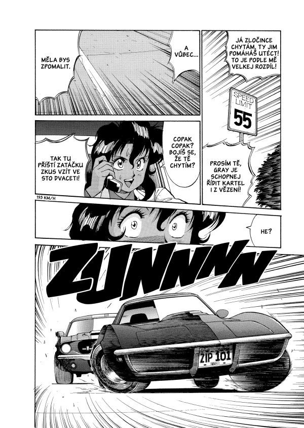 Kresebně je však duo koček velmi precizně odvedenou prácičkou, a i když lze rozpoznat starší rukopis 90. let, je radost sledovat přesné linky, miniaturní detaily a především práci s akční stránkou, která je… no, prostě luxusní. Číst Gunsmith Cats je jako koukat na nějaký akční old-school seriál, od kterého zkrátka nelze odtrhnout oči. Ale vážně. Kresba Sonody je totiž nejsilnější právě v detailním zobrazení aut, zbraní a všemožných akční scén, které na sebe navazují tak nenásilně a přitažlivě, že nad tím až zůstává stát rozum. Jednotlivé přestřelky v sobě mají dávku uvěřitelnosti, krásné gradace, výborné atmosféry spojené s kinetikou, kdy cítíte každý výstřel, odražení či ránu, kterou kulka vyvrtá do těla. Občas se objeví nákres z pohledu první osoby a člověku to pak jen vyvolá úsměv na tváři, neboť tomuhle se říká prvotřídní zábava.