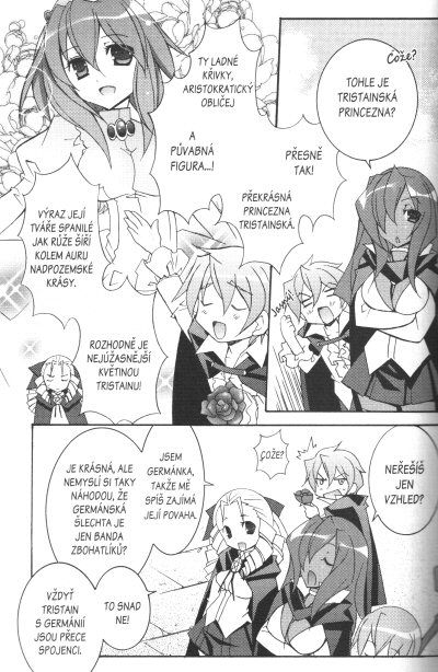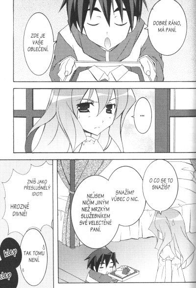 Hlavní zásluhu na zábavnosti však mají především dialogy mezi jednotlivými postavami. Hlavně o neustálé jiskření mezi Luisou a Kirche, které jsou téměř dokonalými protiklady, není nouze. Názornou ukázkou jejich vzájemných „sympatií“ je série scének ve druhém dílu mangy, začínající na str. 154. Další komickou postavou je samozřejmě Saito, jehož neznalost dvorské etikety přivede princeznu Heriettu nejprve do mdlob a poté do extáze. Nejen Luisa má sto chutí Saita za jeho exces potrestat smrtí, zpoza dveří se vyřítí také Guiche, který se díky tomu stává součástí družiny i se svým neslušným krtkem. Aby toho nebylo málo, tak se do děje občas zapojí taky Saitův hláškující, respektive mluvící meč Delfinger, který používá brněnský hantec. V tomto směru musím vyzdvihnout kvality překladatele Jana Horgoše, bez něhož by některé dialogy ani zdaleka nebyly tak zábavné. Jeho překlad z japonštiny je na výborné úrovni a není mu co vytknout. Ve srovnání s „partyzánskými“ překlady do angličtiny, které jsou k mání na některých serverech, je profesionální český překlad jedním z hlavních důvodů, proč si mangu Ve službách Nuly koupit.
