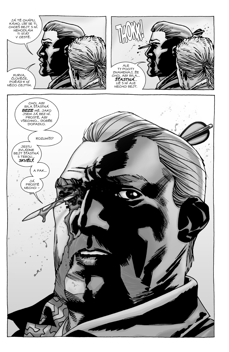 Kirkman je úžasný scénárista. Jak jinak vysvětlit, že jeho mini příběhy o jednotlivých postavách dokáží tak dlouhou dobu bavit a neztratí se ani v návalu hlavní dějové linie okořeněné právě novým záporákem? Každý má svůj moment, každý je jinou osobností a bez každého z nich by svět oživlých mrtvol byl o něco chudší. I přesto, že přichází Negan, má každý jednotlivec svůj zábavný moment, dialog či rozhodnutí, čímž je svět komplexní a hrozivě atraktivní. A jsou to právě postavy, díky kterým jsou Živí mrtví tak neuvěřitelně flexibilní… ať už nastává jedna tragédie, či zase jiná, dané charaktery jsou vám tak blízko u srdíčka, že jim prostě pořád držíte palce a doufáte v to nejmenší zlo. A vše funguje na jedničku.