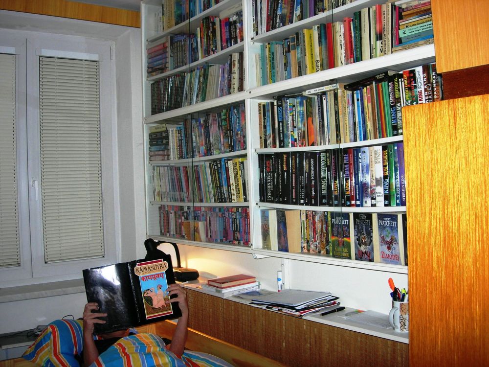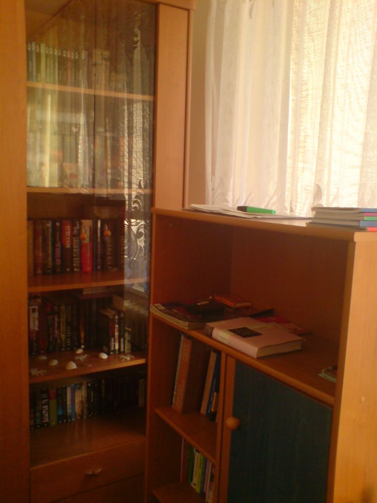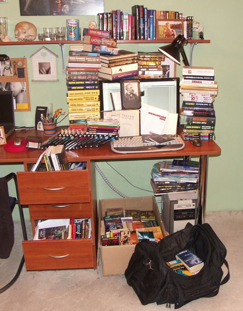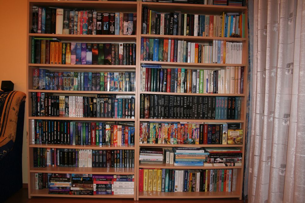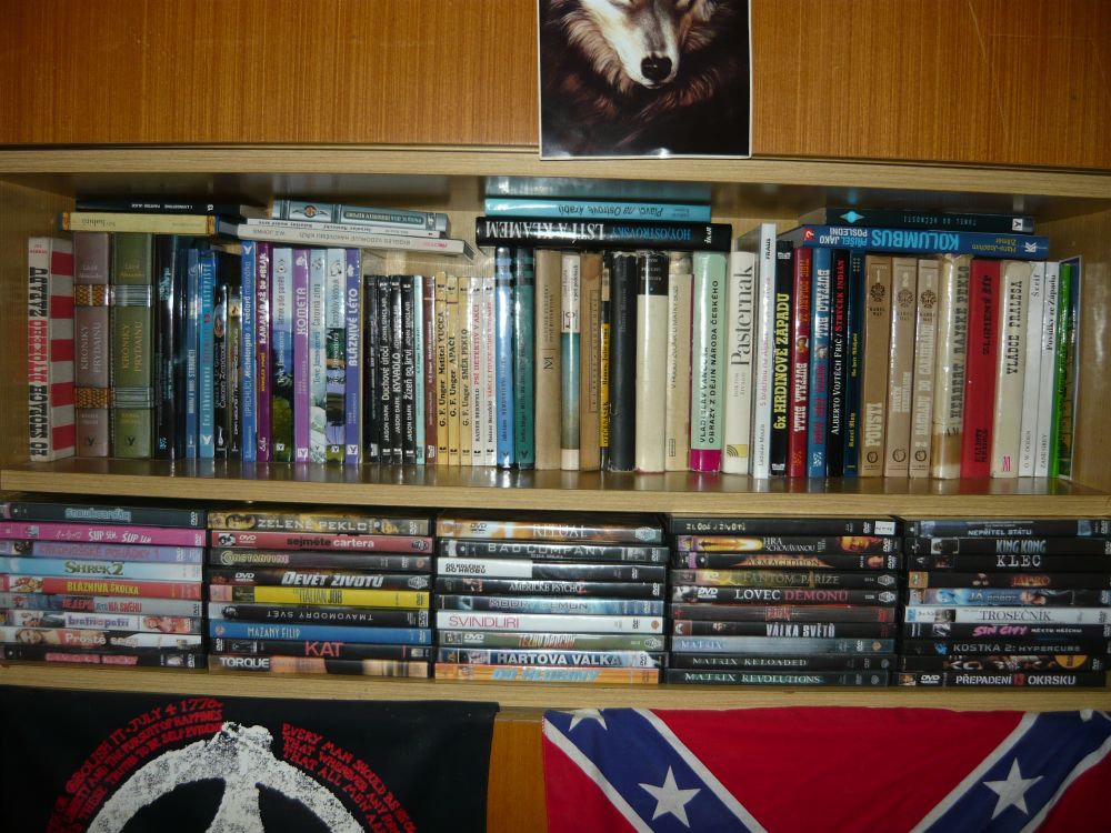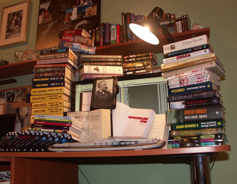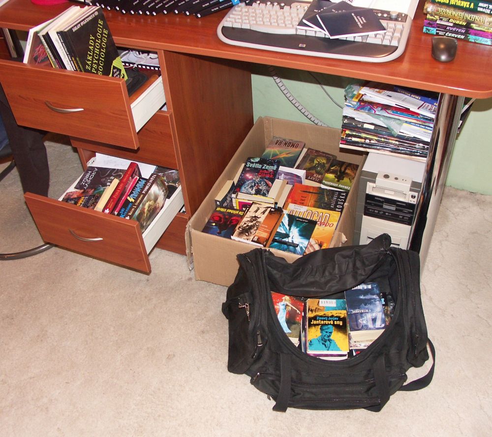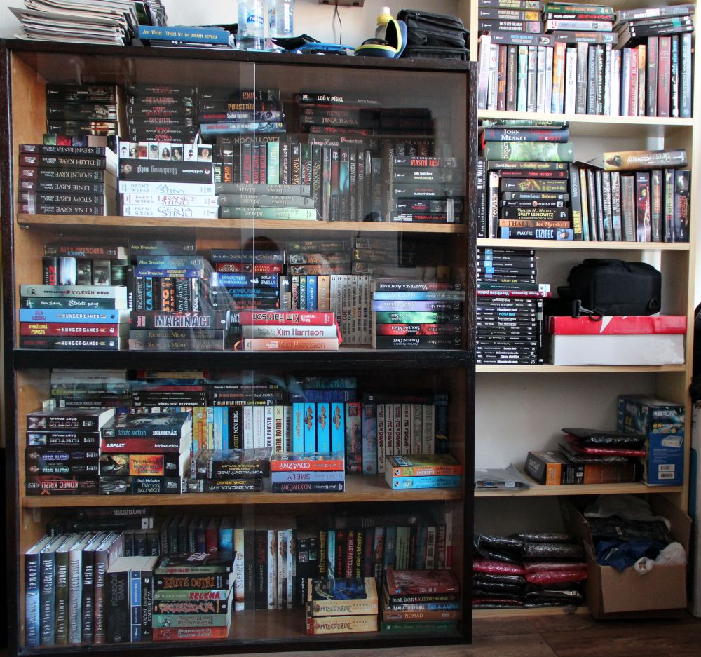 Rodiče vlastní nádhernou dřevěnou knihovnu plnou knih. Jenže studia a následné osamostatnění mi zatím neumožnili vybudovat si řádnou svatyni pro nejdůležitější úschovny informací lidstva – tedy knih. V současné situaci žiji v prostoru 3×2 m a nemám knihy kde skladovat, přičemž musím někde spát. A tak můžete vidět neutěšenou situaci uskladnění mé knihovničky. Naštěstí se sbírka toliko nerozrůstá, neboť jsem si pořídil elektronickou čtečku knih.