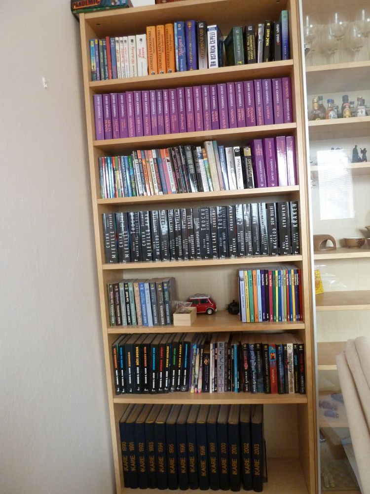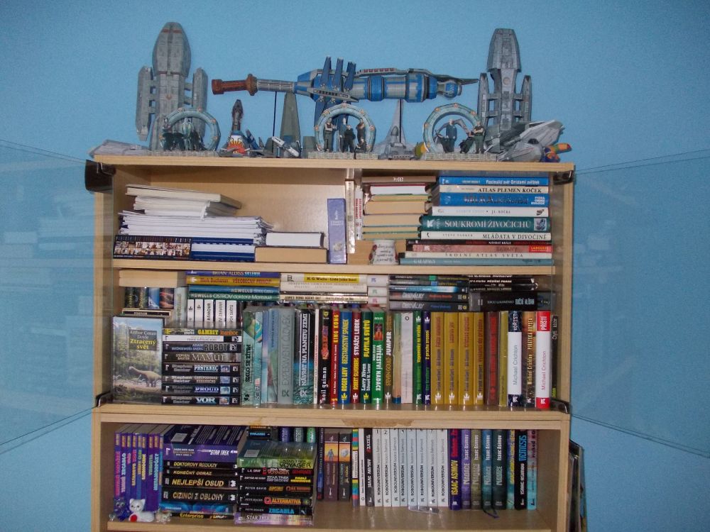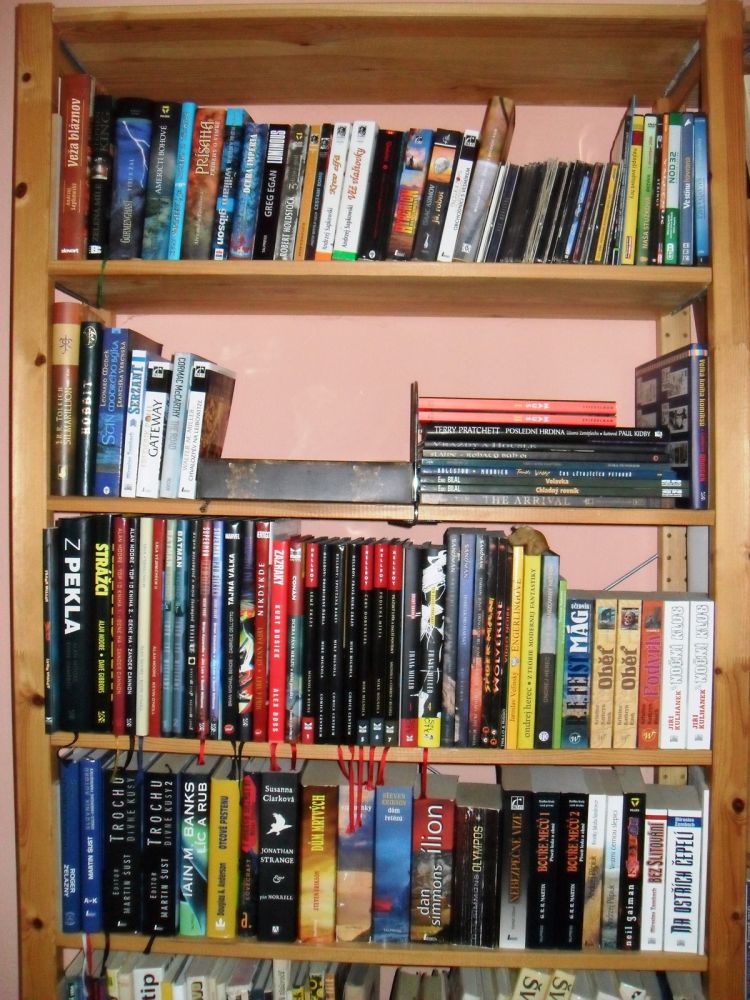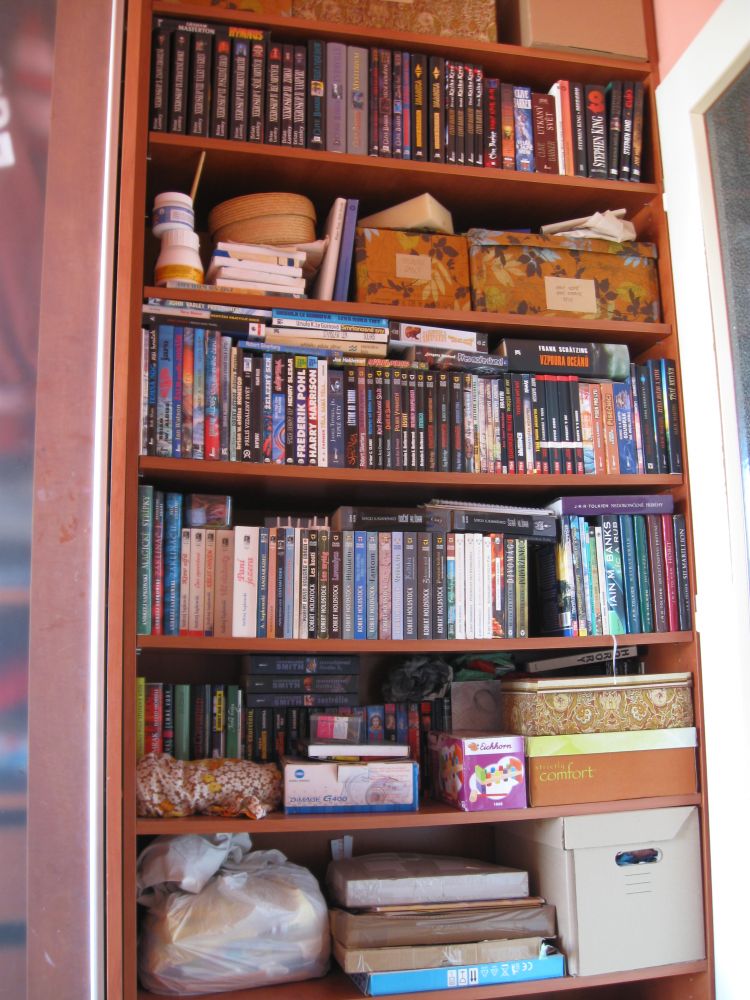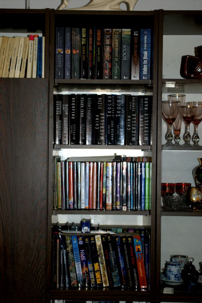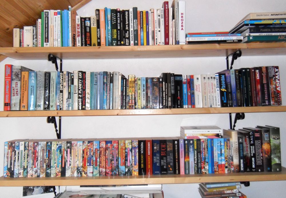 Krvácelo mi srdce při pomyšlení, že mé knižní skvosty pláčou v krabicích a bedýnkách na půdě. Konečně jsem se rozhoupal, podal obstojný kutilský výkon a stvořil „knihovnu“. Každé ráno se tak probouzím pohledem na přehlídku literárních špiček mého oblíbeného žánru, s jejichž tvorbou jsem strávil většinu svého života. Abecedně namátkou Adams, Aldis, Asher, Asimov, Clarke, Herbert, Kopřiva, Kulhánek, Neff, Pratchett, Sapkowski, Simac, Souček, Strugačtí, Tolkien, Žamboch… Jen pro přesnost, nejstarším kusem jsou „Pozemšťané a mimozemšťané“ z roku 1981 a nejnovějším vánočním přírůstkem „Čerpadlo 6“ a „Obléknu si půlnoc“, která je mimochodem již 46. kusem od Terryho. Opravdu historické kusy Verna a albatrosí série „knihy odvahy a dobrodružství“ mají čestné místo mimo záběr v pravé horní části. Myslím, že by se v ní ještě nějaké místečko našlo a zasloužila by si rozšířit o nějakou další literární perlu žánru sci-fi nebo fantasy.