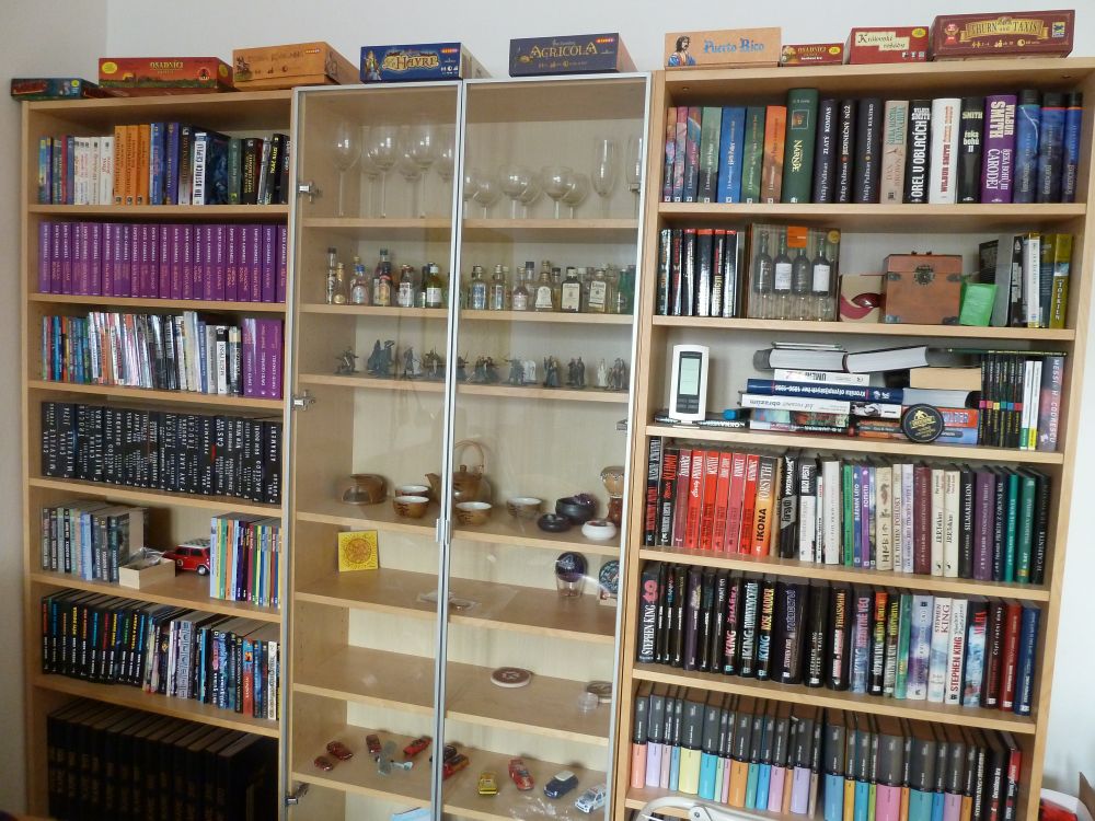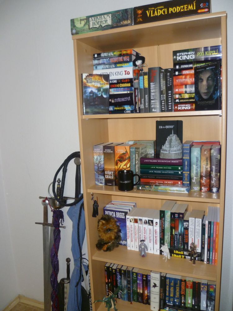 Legenda se k mé knihovně neváže žádná. Postupem času se vytratil jakýkoli pokus o přehledné řazení, zůstal jen pozůstatek dávného žánrového rozřazení, který už nejsem schopna dodržovat (a jednotlivé police prostě nejsou nafukovací ). Jediný Stephen King se dočkal stálého řazení, a to podle data původního vydání. Zároveň se pro mě knihovna stala i místem, kam ukládám drobné předměty čistě sentimentální hodnoty (dárky od přátel, výhry v soutěžích), tudíž se zde, kromě knih, na jednom místě setkávají třeba takový plyšový Žvejkal a model Minas Tirith.