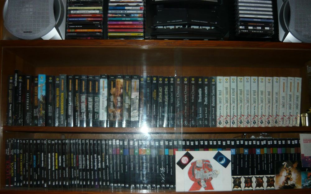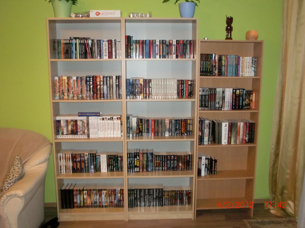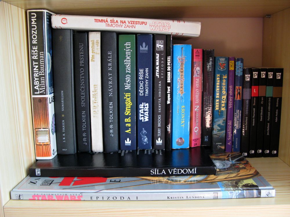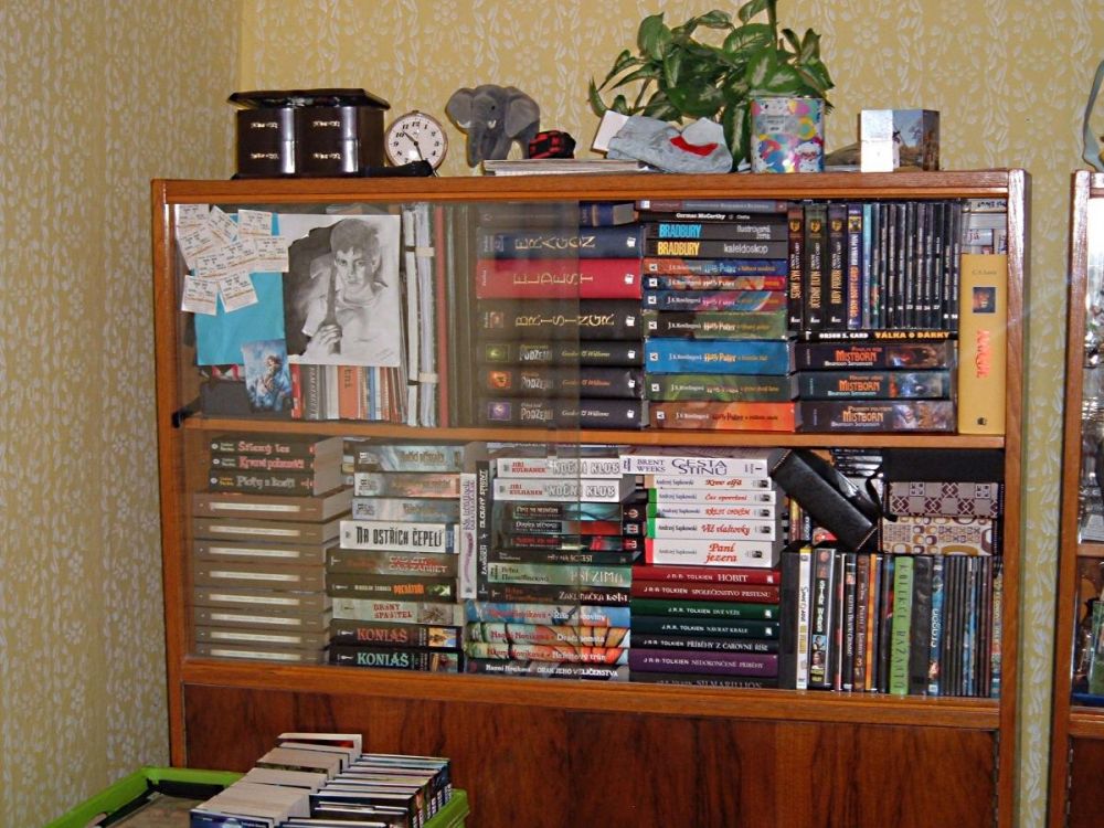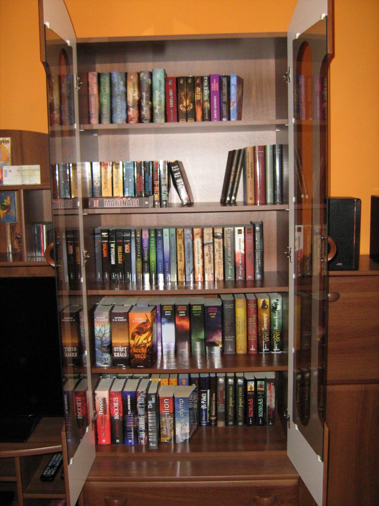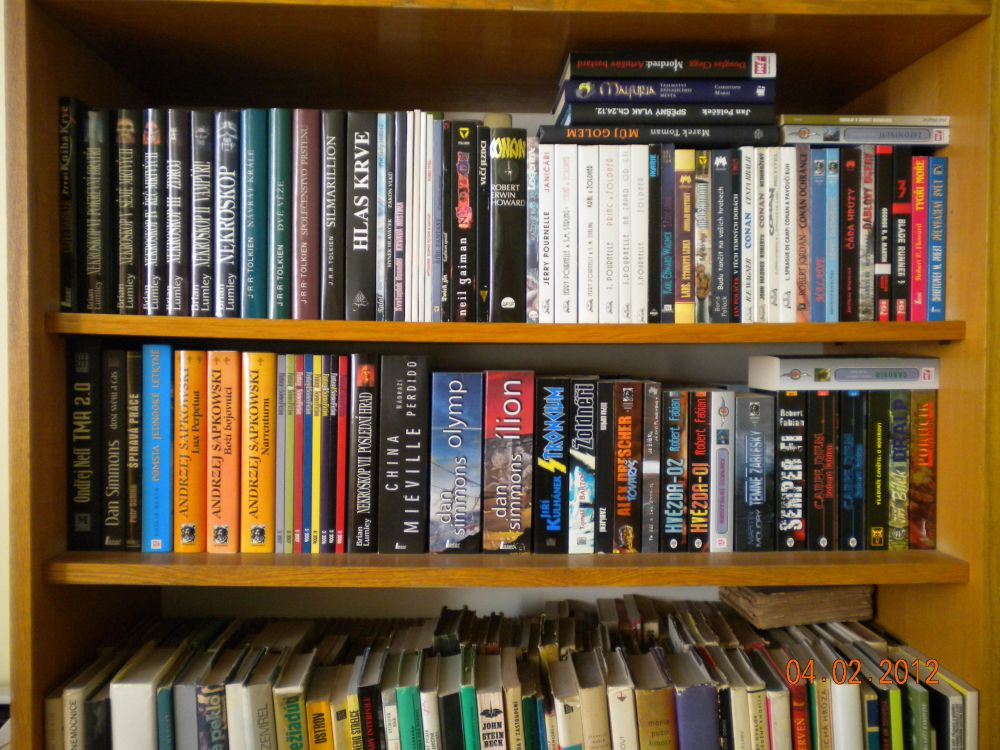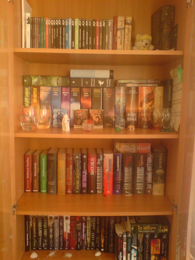 Proč by měla „vyhrát“ moje nevelká knihovna? Myslím, že je v ní spousta „hodnot“, které stojí za přečtení. Některé schované ve 2. řadě. Rozšířená o pár historických/náboženských/psychologických věcí, které ale v podstatě k žánru fantasy taky patří; a někdy i ke sci-fi. Neváhal jsem v některých „tohle opravdu ne“ případech se knih i zbavit (někomu dát nebo prodat), např. kompletní Kroniky Fey (Rusch Kathryn Kristine), Shannarův meč (Terry Brooks).. Až na výjimky se v knihovně nevyskytují staří mistři žánru (Asimov, Clarke, Aldiss, Strugačtí..) a knihy povídek – ty byste našli u mého tatíka. A ještě poznámka k druhé půlce knihovničky: Tady probíhá dlouhodobá diplomaticko-strategická bitva o prostor a význam s mojí ženou. Nějaké „zbytky“ úporně bráněných knih se tam najdou (Fulgum, Viewegh, knihy o Elvisovi a další), ale ještě není nutné házet meče, kopí nebo sudlice do obilnin, boj ještě neskočil. Takže už kvůli té bitvě za „naši“ věc..;-)