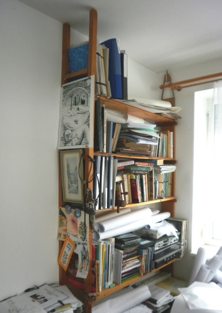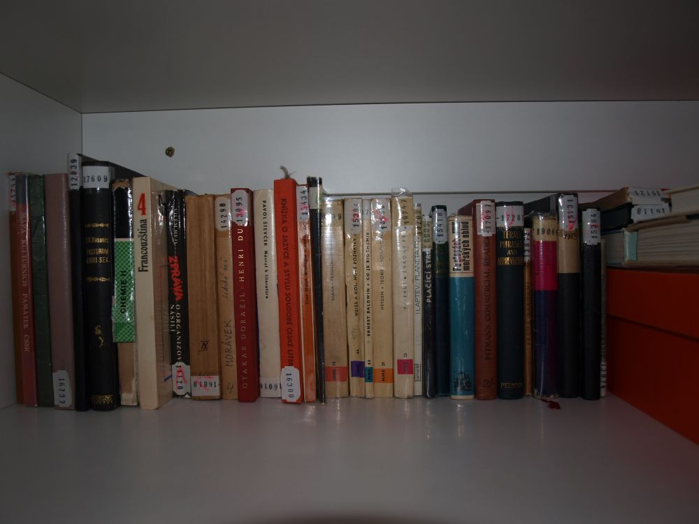 Záležitost, která skončila poslední, není ani tak knihovna jako spíš “bedýnka s (intelektuálním) nářadím”, kterou mám v kanceláři. Jsou v ní nejen knížky, ale i odborná literatura, štos starých Ikarií, pár počítačových her, dévédéčka s filmy, nefinkční gramofon a podobně. Asi jsem knihovnu vyfotil ze špatného úhlu, ve skutečnosti vypadá docela úhledně :-).