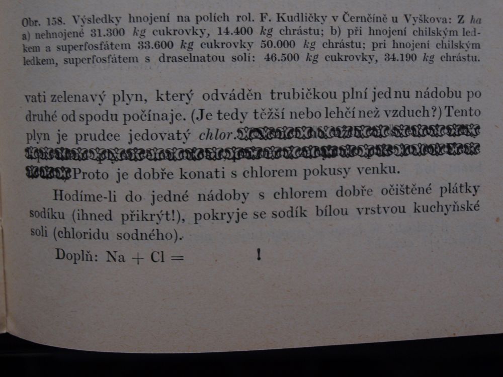 5., 6. A o tento skvost jsem se chtěl podělit, přestože do fantastiky nepatří. Učebnice přírodovědy s válečným přetiskem (z 26. dubna 1941). Vyškrtnuty byly všechny zmínky o Československu a Podkarpatské Rusi a další. Ovšem přetisk je udělán tak umně, že zakrytý původní text jde stále poměrně dobře přečíst (pořád netuším, zda to byl záměr či nešikovnost tiskaře). Takže například u chloru jde stále přečíst že: „Němci ho užili za světové války k prvnímu plynovému útoku, při němž zahynulo přes 10 000 Francouzů.“