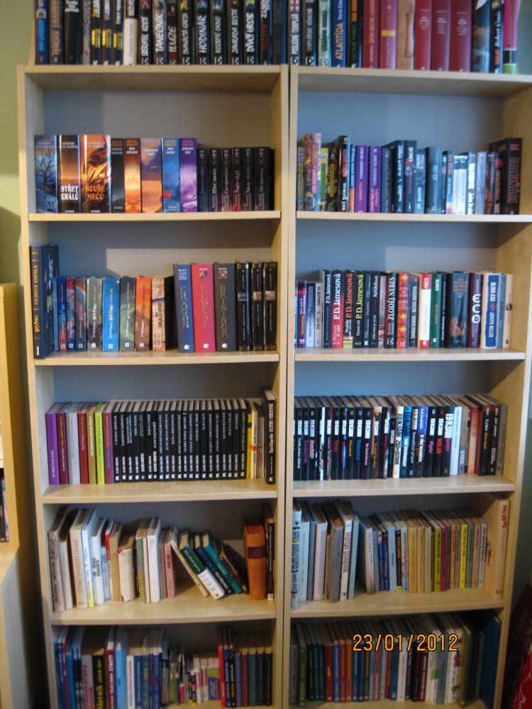 Knihovna, kterou vidíte na fotce, s námi sdílí ložnici a je rozdělena na sektory. Levá část je označena písmenem A, pravá B. Nejvíc sektorů svými knihami a CD okupuje můj partner. Jedná se o sektory A 1–9 (číslováno od shora) a B 2 a 5. Sektory B 8 a 9 obsadily dětské knihy (převažují leporela, která zasahují i do sektoru B 7) a časopisy dvouleté dcery. Fantastické knihy se nacházejí v sektoru B 4. Sbírka Pevností odpočívá v pořadačích mimo sektory na vrchu skříně. Poslední dva ročníky v sektoru B 1 . Police jsou naštěstí dost hluboké, proto knihy můžu skladovat ve dvou řadách za sebou. Sektor B 4 má ještě dost volné kapacity. Velevážená poroto, pomůžete mi s jeho zaplněním? Děkuji.