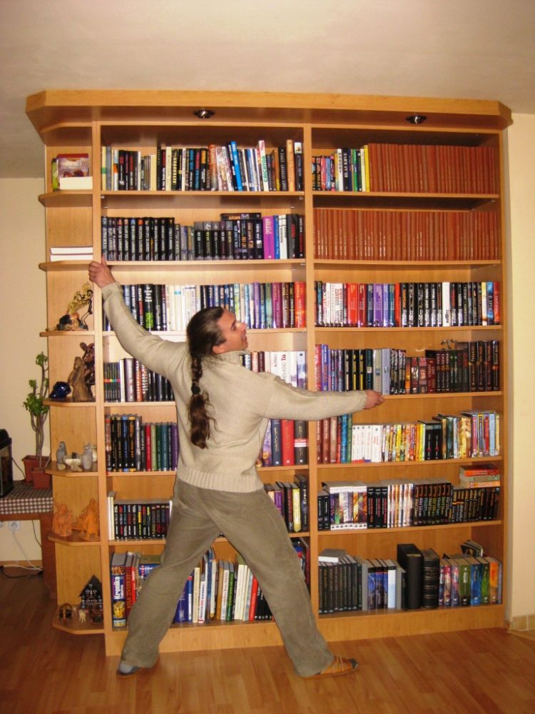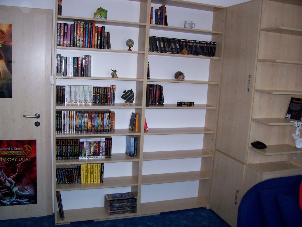 Ke knihám mám zvláštní vztah, prostě je miluju. A to i přesto, že mám zřejmě podivné okolí, protože nikdo, ale absolutně nikdo, koho osobně znám, nečte žánr fantasy nebo sci-fi. Většina známých nečte dokonce vůbec. Proto jsem u mě v práci považován za podivína, když mi do práce cca každé tři měsíce přijde balíček s dalšími cca 8 knihami. Knihy jsem původně skladoval tak porůznu po stolech a v policích určených původně pro něco jiného než knihy, ale rozhodl jsem se, že svoji pracovnu vybavím na zakázku dělanou knihovnou, kam všechny knihy přestěhuji. V práci jsem si nechal od strojaře udělat výkres podle mého zadání a našel jsem si levného truhláře, který mi nabídl opravdu dobrou cenu, včetně montáže na místě. Montáž proběhla dobře a dokonce se nám povedlo šikovně zakamuflovat vypínač, který byl původně na zdi (na fotce jde vidět). Do knihovny jsem tedy přendal všechny své knihy a na knihovnu jsem nesmírně pyšný – i přesto, že ji nikdo z mých známých neocenil :-). Mimochodem, v knihovně mám pouze knihy z fantastického žánru, nic jiného v ní opravdu nenajdete. Dole v poslední polici je časopis Pevnost, který mám už pár let předplacený. I když zřejmě nic nevyhraju, tak se snad bude knihovna líbit.