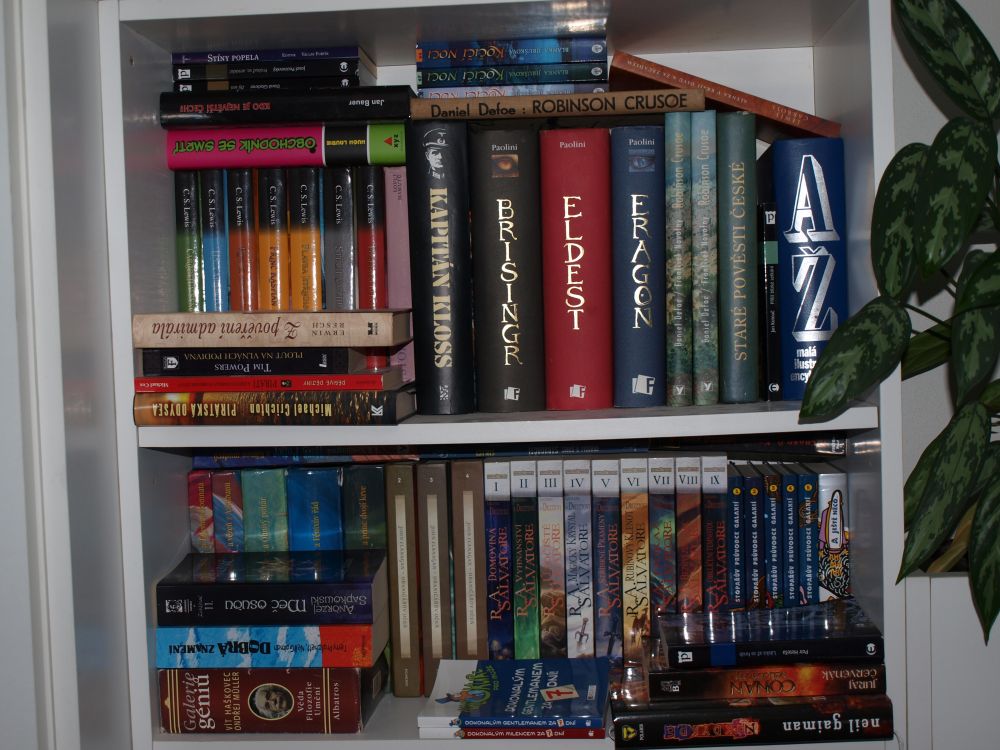 1. Sice jsem vlastníkem vcelku obligátní knihovny, ve které je hromada místa, ovšem vzhledem k tomu, že těch několik bílých polic zaštiťuje většinu knih členů domácnosti, na fantastiku mám vyhrazené dvě přetékající poličky (i když i tam se zvládly nacpat nefantastické knížky). Vzhledem k tomu, že volný prostor zase mizí do jiných dimenzí, musel jsem některé knížky nacpat do nefantasy částí knihovny. Obzvlášť první díl Zaklínače se krásně vyjímá mezi klubem odložených žen a růžovou *zakázanou láskou. *A pokud se vám zdá, že v pravém horním rohu vidíte dva totožné exempláře Robinsona Crusoe (nemluvě o třetím odlišném vydání), tak to je jev způsobený rozestupem asi pěti let a mírnou senilitou darujícího. Nepovažuji svou knihovničku za dostatečně zajímavou na výhru nějaké z cen, ovšem kdyby se tak stalo, tak nahoře je důvod, proč já budu mít tu smůlu, že to bude zrovna druhé místo :-).