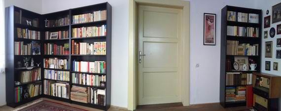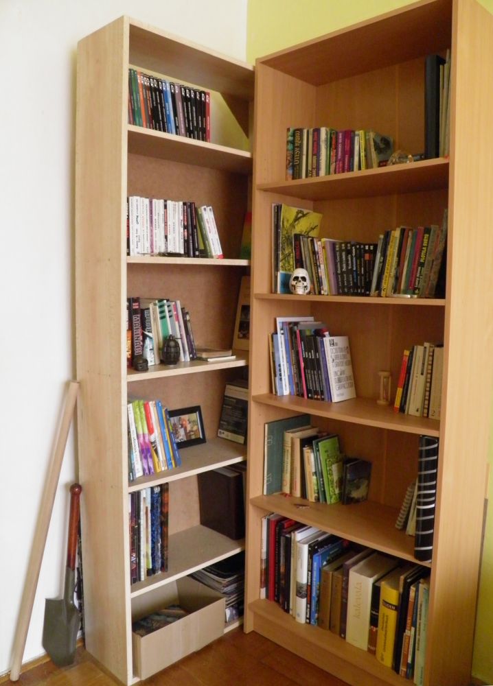 Má knihovna nevyniká počtem svazků. Od rodičů jsem se odstěhoval teprve nedávno a otec prohlásil, že mé oblíbené Dveře do léta či Příběhy pilota Pirxe a další knihy si odnesu jen přes jeho mrtvolu. Otcovraždy jsem se dopustit nechtěl, začínal jsem tedy od nuly. Nutno vyzdvihnout přínos mé knihovny (levé křídlo) pro celosvětovou ekologii. Domnívám se, že se díváte na jediný exemplář knihovny vyrobené z postele, tudíž z recyklovaných materiálů. Knihovna je zároveň pomníkem mého kutilství. Z fotografií je patrné, že jsem musel část knihovny pod pohrůžkou fyzického násilí propůjčit přítelkyni na její nonfiction svazky. Dekorativní předměty, ruční granáty, boxer a vystřelovací nůž tvoří dědictví po dědečkovi, vášnivém militaristovi. Nedílnou součástí je dřevěná hole a polní lopatka. Hole je určena nezvaným hostům a polní lopatka tvoří první linii obrany pro případ zombifikace nejvyššího stupně. Jsem uvědomělý a zodpovědný, nenechávám tohle riziko nepovšimnuto. Snad vás má knihovna zaujme.