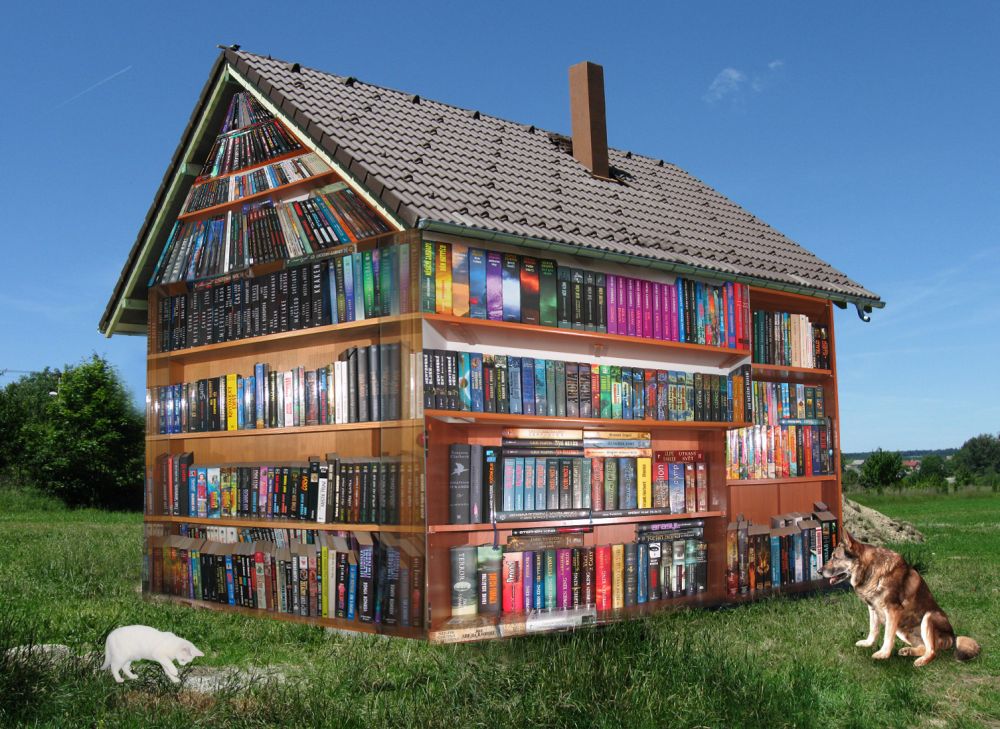 Kušuj!:-) První nápad byl vyrovnat knížky kolem domu jako dříví, ale to by bylo pracné a ve stávajícím počasí ke knihám brutální. Druhý nápad byl naskládat je jenom do otevřeného okna, jako by se sypaly ven, ani tohle se při teplotách -20 nejevilo jako ideální řešení. Tak přišel na poslední chvíli ke slovu Photoshop, no – však ty police knih jsou autentické (a neúplné).