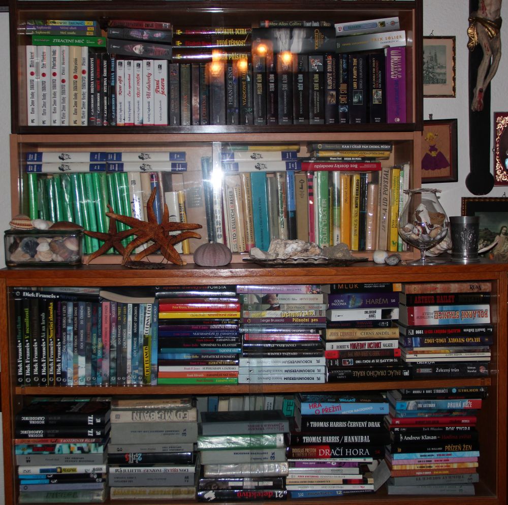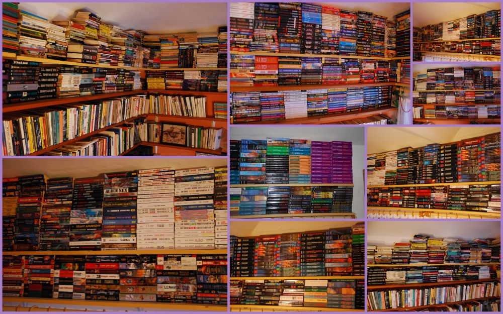 Vytvořil jsem koláž z pár fotek narychlo vyfocených v naší „uklizené“ a „odkládací“ zděděné knihovně. 🙂 Máme to zkatalogizované, to by z nás měly knihovnice radost. Knih je tam hafo. Doslova 1617 česky a 238 slovensky nebo polsky. Ale občas tam jsou vidět i knížky z „máminy“ knihovny, které v katalogu nemám. Třeba se vám bude líbit. V rámci úspory místa jsme sjednotili nakladatelství, řady a další. Snad nás nepřijde vykrást nějaký fanoušek sci-fi, fantasy, hororu. 🙂