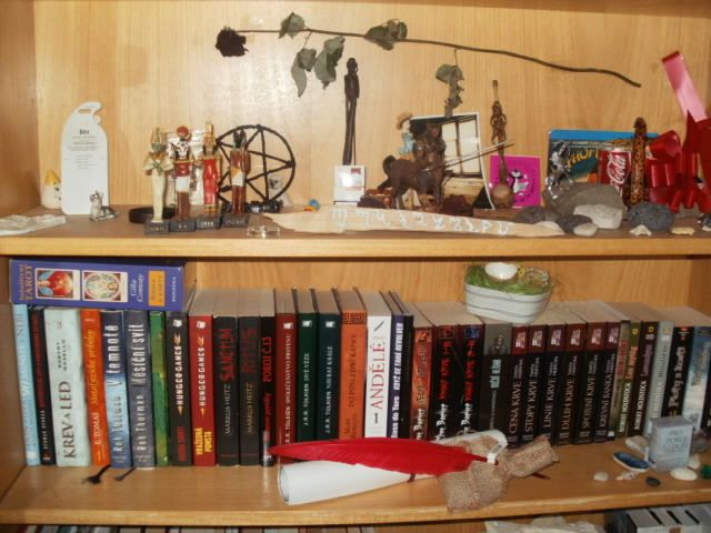 Posílám vám fotku svojí knihovny, na kterou jsem opravdu velice pyšný. Má knihovna má 3 regály, které jsem rozdělil do tří etap. V nejvýše postaveném regálu jsem si vytvořil výstavku z pro mě důležitých, nebo darovaných věcí. Jelikož jsem opravdu člověk, který se fantazii nebrání, mám i ručně vytvořený kolík na upíry, který je důkazem mé obliby seriálu Buffy, přemožitelka upírů. V prostředním regálu mám vystavené fantasy a hororové knihy. Mezi nimi můžete najít třeba sérii Hunger Games, Krevní pouta, pár knih od Cliva Bakera, mezi kterými samozřejmě nechybí Knihy krve, či oblíbené duo knih od Markuse Heitze Ritus a Sanctum. Mám zde i spoustu dalších knih, které mě zaujaly svým obsahem. Ve spodní části knihovny mám vystavené knihy s ostatní tématikou, které by neměly v knihovně chybět. Tato čát knihovny se mi však na fotografii nevešla. Doufám, že se vám moje knihovna bude líbit stejně jako mě. Nedám na ni dopustit.