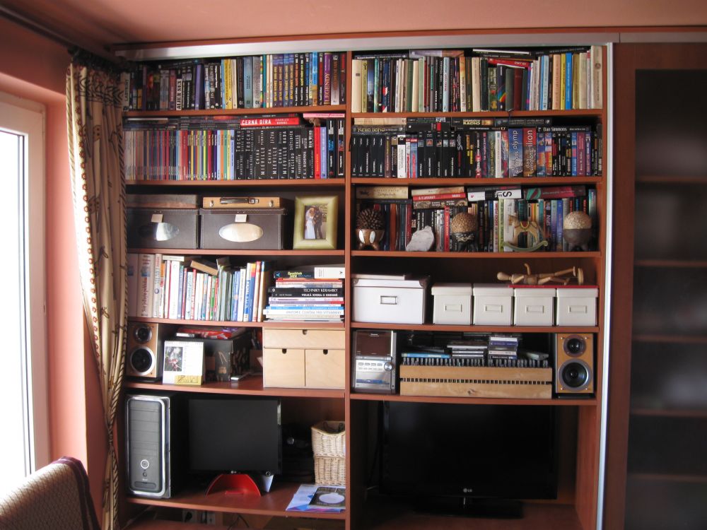 Naše knihovna (založila ji maminka a úspěšně ji rozšiřujeme spolu) asi žádnou cenu nevyhraje, ale úpěnlivým prosbám (šéf?)redaktorky nelze nevyhovět. Žádné zajímavé historky o založení (to jsem ještě ani číst neuměl) ani cenové odhady trousit nebudu. Následující fotografie mohou posloužit hlavně jako odstrašující příklad naprostého chaosu v řazení a umístění knih. Uvedu krátký popis umístění.