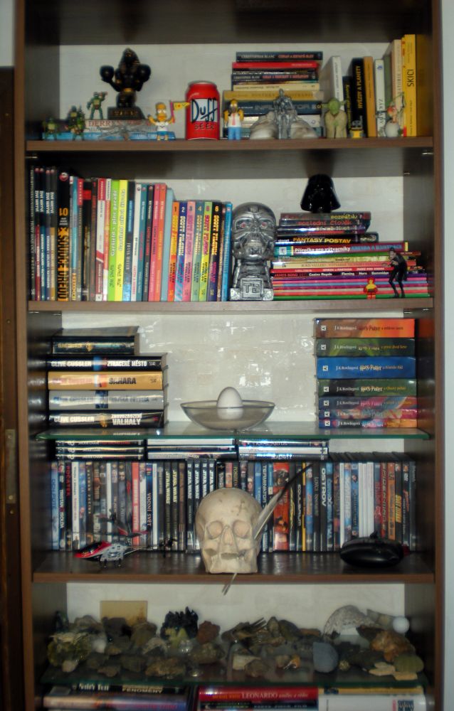 Moje knihovna je spojením starého s novým, její jádro tvoří svazky po předchozích generacích, které položily základ prvními díly námi dodnes oblíbených klasiků. Knížky od J.Verna nebo A.C.Doylea jsou tak proložené aktuálními sbírkami fantasy povídek, první morální sci-fi – komiks Rychlé šípy sdílí prostor s několika sériemi japonské mangy. Knihovna je zatím nedokončená, spousta budoucích obyvatel odpočívá v „depozitu“, ale i to je součást hry: řekněte sami, kdy jindy se člověk vrátí k osvědčeným dílům, když ne právě při reorganizaci knihovny :-).
