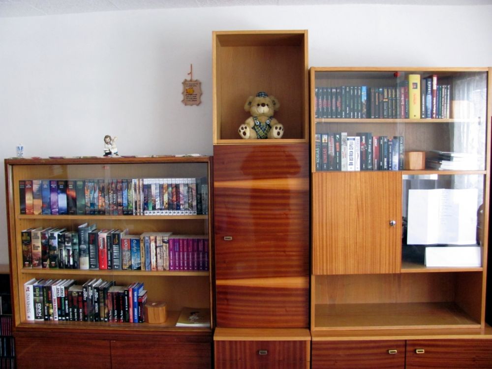 Foto 2 – Na šatní skříni taktéž v mém pokoji se nachází beznadějně zaplněná miniknihovnička obsahující vesměs série z 90tých let.