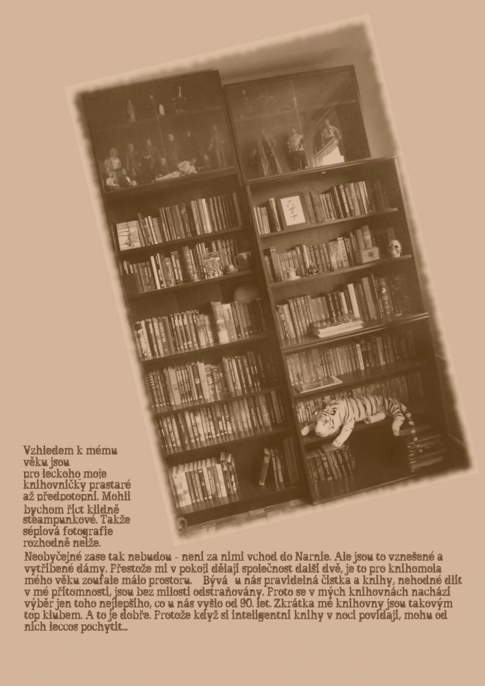 Před dávnými a dávnými časy se jeden študent, okouzlen Narnií, Středozemí a Zaklínačem, rozhodl, že nebude knihy jen číst, ale taky vlastnit. Mazlit se s nimi, ochmatávat je, necudně je otvírat, na které stránce se mu zlíbí. Inu, měl touhy jako každý dospívající. A protože to byl študent chudý, vybíral si knihy hlavně při svých antikvárních rejsech po moravské metropoli. Ani prodejny Levných knih nezůstávaly jeho chtivých pazourů ušetřeny. Syslil, křečkoval, sháněl, kšeftoval, chodil si pro rozumy a tipy do Arrakisu a občas tam i nějakou tu korunu zanechal. Jak duševně rostl on, rostla i jeho knihovna až dosáhla kritických rozměrů a bylo třeba ji umravnit, neboť začala žít svým životem a chtěla bobtnat dál, nehledíc na to, že mentální a časové možnosti jejího majitele nestačí byť na jediné její přelouskání. Proto se on, nyní již pracující ženáč se závazky, rozhodl dát jí tvar a řád. Umravnit ji. Zkrotit. Avšak běda! Knihovna se mezitím zkřížila s výtvarnými proprietami jeho lepší polovičky a daly vzniknout zcela novému druhu bránícímu se lidskému zásahu a projevujícímu elementární znaky inteligence. Výslednou podobu lze spatřit na přiložených snímcích. Tímto Vás prosím, vážený Deratizátore, o neprodlený zásah. Toto je volání o pomoc.