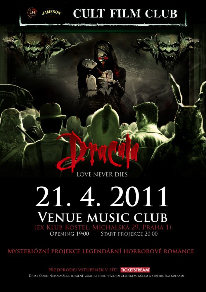 Již ve čtvrtek 21. 4. se otevřou brány pekel a v děsivých útrobách Kostela sv. Michaela Archanděla u Staroměstského náměstí (dnes Venue music club, Michalská 29, Praha 1) povstane mocný Dracula se svou družinou z hlubin nejtemnějších bájí, aby vás na rozhraní života a smrti poctil svou děsivou společností a fatálním příběhem své oddané vášně. A to nejen prostřednictvím filmové projekce… Temný éter a famózní scenérie, které neodmyslitelně provází Coppolovo ztvárnění tragické legendy, vás obklopí hororovou atmosférou nasáklou pachem krve a naplní pocitem všudypřítomného napětí přímo mezi chladnými zdmi historického kostela.